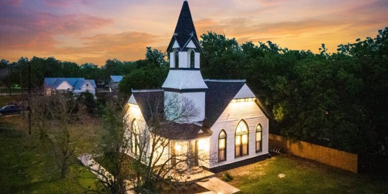 The Victorian-style church is located in Bartlett, a small Texas city of about 1,600 residents. The Victorian church’s steeple survived, but the paint was peeling, the windows were broken, and the building was leaning slightly to the left.
