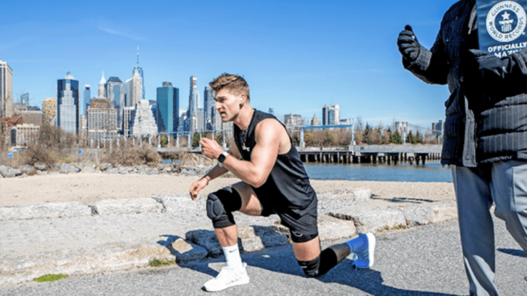 Austin Head broke the Guinness World Record for most lunges in an hour by performing 2,825 lunges along the Dumbo waterfront in Brooklyn on Monday.