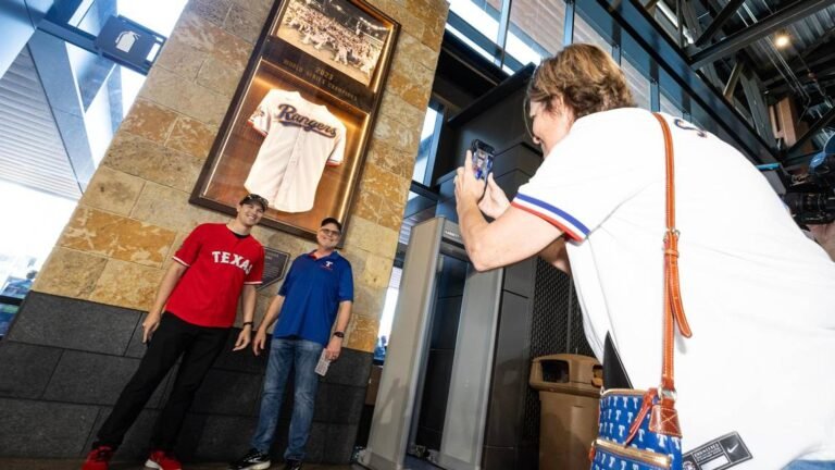 Framed Rangers jerseys, photos and plaques near Section 140 at Globe Life Field. Lawrence Dow